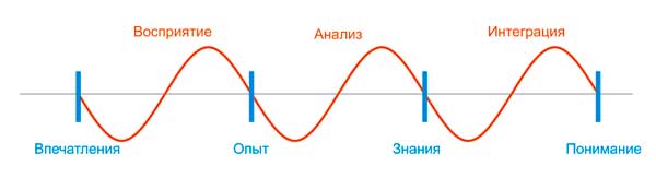 Итак, нам давно известно триединство: Восприятие – Анализ – Интеграция. Хочу обратить внимание на то, что это триединство процессов, так как каждая позиция является неким процессом. Осмелюсь ввести постулат о том, что любой процесс имеет под собой волновую природу. Однако достаточно очевидно, что любой волновой процесс это процесс ограниченный рамками, пределами, фазовой решеткой. Струна играет лишь потому, что ее концы закреплены. То есть имеется единство структуры и процессов. Это пока лишь очень укрупненное отображение. Что может быть рассмотрено как некие пределы, ограничения в триединстве процессов Восприятие – Анализ – Интеграция? Рассмотрим предлагаемый рисунок. Это лишь некая условная линейная проекция, к которой не следует придираться. Она лишь отражает мысль, пускай в очень профанированном виде. Действительно, Впечатления, Опыт, Знания, Понимания – это не есть процесс. Это скорее «остановленное мгновение», некая позиция, в рамках процесса жизни человека, как системы. Можно всегда сказать, что Восприятие – суть процесс, ограниченный с одной стороны набором конкретных Впечатлений, с другой стороны – отражение конкретного Опыта. Анализ – процесс, ограниченный конкретным Опытом и Знаниями в рамках сознания одного человека. Интеграция – процесс, ограниченный Знаниями и ведущий к конкретному Пониманию, которое в свою очередь в результате другого опыта может привести к переосмыслению одних и тех же знаний приводя к уже другому пониманию и так далее - цикличность процесса развития. Еще раз имеет смысл обратить внимание на единство тройки процессов и четверки качеств, отражающих взаимодействие части Целого, то есть сознание человека с окружающим его пространством, что, по сути, означает самоидентификацию части целого с самим собой. Пренебрежение какими-то аспектами целого неизбежно приведет к перекосу. -------------------- С уважением...
