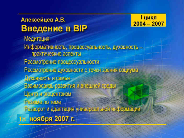 2005-2008 A_34_18.11.2007 Информативность - процессуальность - духовность. Аспекты практики. Содержание 1. Медитация 2. Информативность - процессуальность - духовность - практические аспекты 3. Рассмотрение процессуальности 4. Рассмотрение духовности с позиции социума 5. Духовность и семья 6. Взаимосвязь развития и внешней среды 7. Центр и эгоцентризм 8. Резюме по теме 9. Разворот и адаптация универсальной информации Смотреть видео онлайн Часть 1 Часть 2 Часть 3 Часть 4
