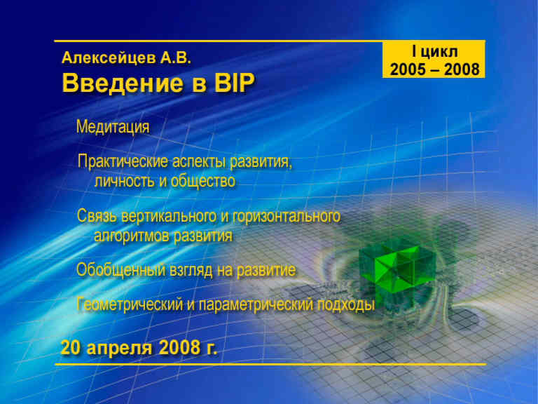 2005-2008 A_39_20.04.2008 Два пути развития Активного сознания: практические аспекты. Содержание 1. Медитация 2. Практические аспекты развития, личность и общество 3. Связь вертикального и горизонтального алгоритмов развития 4. Обобщенный взгляд на развитие 5. Геометрический и параметрический подходы Смотреть видео онлайн Часть 1 Часть 2 Часть 3 Часть 4