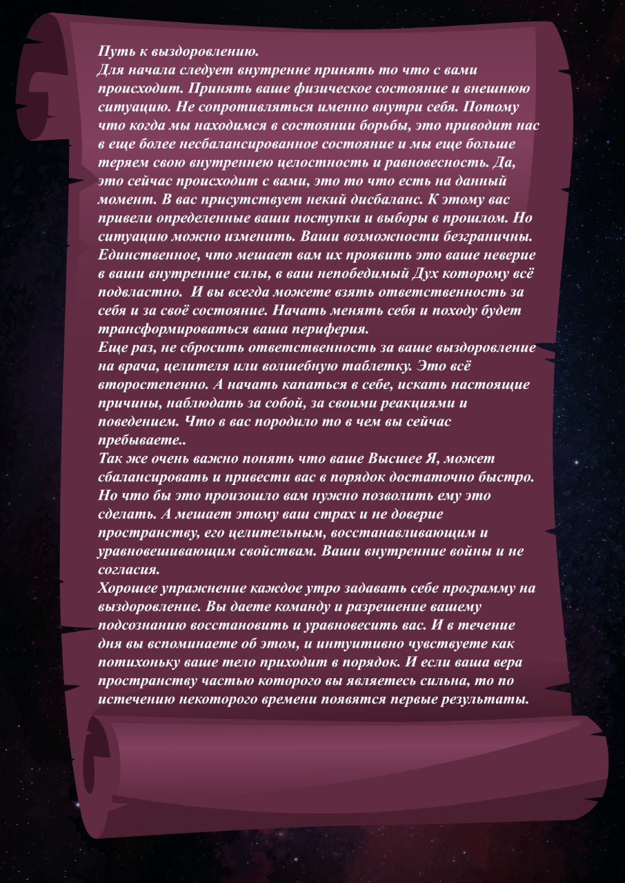 Еще некоторые мои размышления. В процессе выздоровления, а то есть уравновешивания себя очень важно обратить своё внимание на наши реакции и отношение к жизни. Как мы реагируем на окружающий нас мир, на ситуации вокруг нас и на людей с которыми мы взаимодействуем. Наше внутреннее не приятие чего либо порождает в нас кучу негативных эмоций и реакций на окружающее нас пространство и таким же образом это отражается на нашем физическом теле приводя его в дисбаланс ( к болезни ). И поэтому по мере того как вы будете приводить себя в более осознанное и адекватное состояние, ведя постоянное наблюдение за собой, за своими мыслями и за тем как пространство вас тестирует и проверяет на устойчивость вы начнете замечать насколько сильно вы запрограммированы и зависимы от пространства. Когда любое изменение ситуации не по " вашему плану" вы отторгаете, а не пытаетесь на внутреннем уровне принять и разобраться что за этим стоит. В чем замысел Творца. А это бывает очень опасно потому что при таких обстоятельствах Жизнь может начать отторгать вас. Поэтому возможно стоит попробовать посмотреть на жизнь не много с другого ракурса. Как на определенную игру, в которой вы можете проработать свои внутренние качества, с каждым разом становясь более чем то кем вы осознавали себя до этого. Повышая уровень своего сознания и ощущая себя все более целостным и единым со всей Жизнью. Мария Кудряшова Всем добрый день! Вчера мне пришли знания, созвучные тому, что изложил Роман. Это был не поток мыслей, а именно знания. Казалось, их содержание можно изложить одной фразой, но трансформация полученного на наш язык получилась более объемной. Вопрос был о цели нашего существования. Цель души - пронести через все свои проявления то равновесие, которое мы называем нравственной чистотой. В процессе жизней душе предлагаются разные испытания. И только пройдя их в балансе ( не нарушая равновесия своего и других, она вернётся к Истоку. Так Он развивается( расширяется). Вопрос в том, что не нарушить равновесие другого можно лишь в том случае, если другой сам сбалансирован. Роман Яковлев Мне кажется что бы не нарушить равновесие другого, достаточно предоставить этому человеку свободу воли и выбора, насильно не навязывая ему наше виденье. Когда мы становимся сами все более уравновешенны - ситуация вокруг нас так же меняется. Либо мы перестаем встречаться с неуравновешенными людьми либо просто при взаимодействие с ними они начинают вести себя по-другому. То есть наше внутреннее состояние подсознательно влияет на них. |