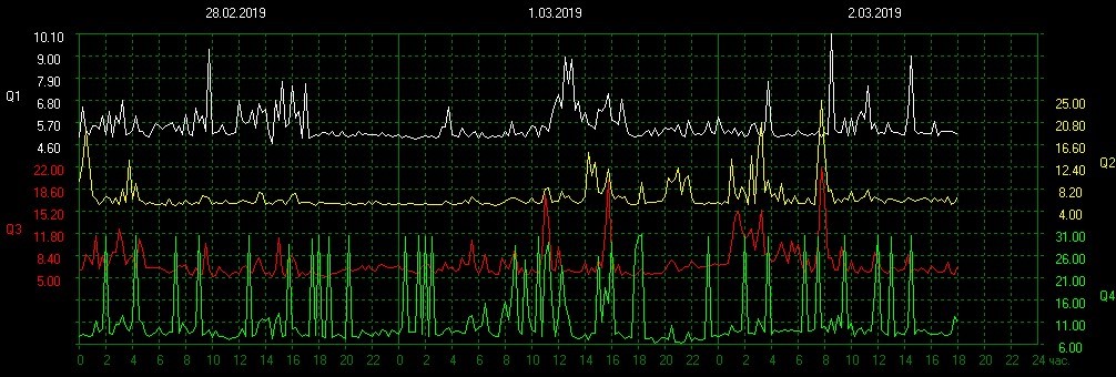 Наблюдения за изменением параметров добротности Наблюдения проводились с 30.11.2016 года. Если рассматривать характеристики добротности, то, начиная с апреля 2018 года, наблюдается интересный процесс - частое повторение одного и того же параметра – 31единица. Стабильное проявление этой характеристики добротности с короткими отклонениями в разные стороны отмечалось в следующие периоды времени: 08.04.2018 – 07.06.2018 23.07.2018 – 16.12.2019 Дальше пошло постоянное колебание этого параметра вплоть до 22.03 2020. Надо дополнительно отметить, что небольшие флуктуации добротности в вышеуказанный период перемежались редкими, но очень сильными вспышками. Например: 03.03.2019 параметр добротности взлетел до 190 единиц и дальше резкий спад до обычных цифр. Комментарий к графикам: Зелёный график в добротностях с июля месяца 2018 года стоял почти стабильно на отметке 31, но в ночь со 02.03 на 03.03 показатели подскочили до 190. Все остальные – тоже…. 26.11.2019 Параметр добротности увеличился похожим образом до 150 единиц и опять сразу произошёл резкий спад до стандартных значений. 01.03.2020 Параметр добротности взлетел до 230 единиц, далее опять произошёл резкий спад, как и в прошлые периоды, до флуктуации вокруг стандартного параметра вплоть до 22 марта 2020, когда снова установился стабильный процесс с характеристикой 31 единица. |