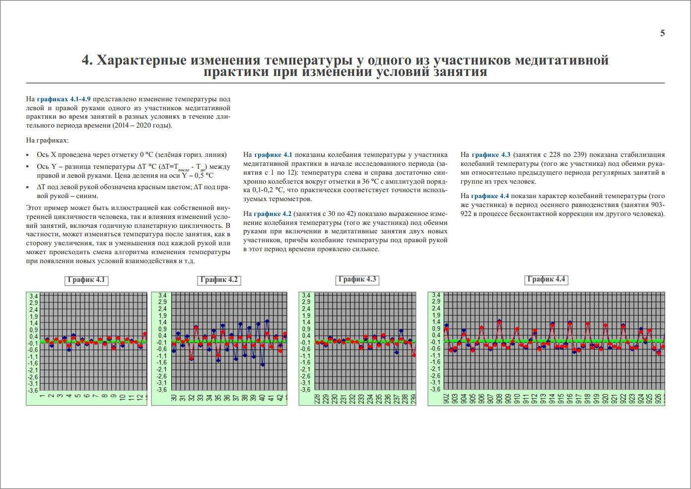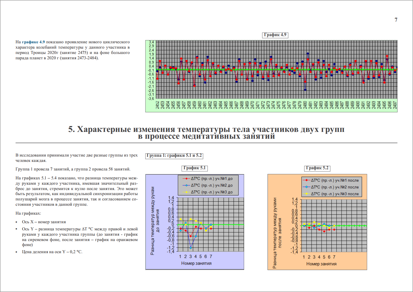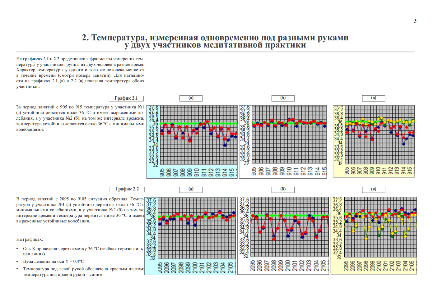 Результаты исследования 1. Температура, измеренная одновременно под разными руками у одного из участников медитативной практики На графике 1 показано, что разница повседневной температуры под левой и правой руками человека может быть более 1 °C. Кроме того, изменение температуры под разными руками может происходить несинхронно, а иногда и в противофазе. ![]() 2. Температура, измеренная одновременно под разными руками у двух участников медитативной практики На графиках 2.1 и 2.2 представлены фрагменты измерения температуры у участников группы из двух человек в разное время. Характер температуры у одного и того же человека меняется в течение времени (смотри номера занятий). Для наглядности на графиках 2.1 (в) и 2.2 (в) показана температура обоих участников. За период занятий с 905 по 915 температура у участника №1 (а) устойчиво держится ниже 36°C и имеет выраженные колебания, а у участника №2 (б), на том же интервале времени, температура устойчиво держится около 36°C с минимальными колебаниями. В период занятий с 2095 по 9105 ситуация обратная. Температура у участника №1 (а) устойчиво держится около 36°C с минимальными колебаниями, а у участника №2 (б) на том же интервале времени температура держится ниже 36°C и имеет выраженные устойчивые колебания. ![]() 3. Устойчивое понижение температуры тела в процессе системных медитативных занятий на примере одного из участников медитативной практики На графиках 3.1 и 3.2 представлены два фрагмента графика температуры у одного и того же человека в начале исследования (номера занятий с 1 по 25) и по истечении некоторого времени (номера занятий с 787 по 809). ![]() На начальном этапе занятий (график 3.1) температура под левой и правой руками была стабильно выше или равна 36°C. По истечении времени (график 3.2) температура значительно снизилась и стала стабильно ниже 36°C, причём в некоторых занятиях она опускалась значительно ниже (занятия 798, 804, 808). 4. Характерные изменения температуры у одного из участников медитативной практики при изменении условий занятия На графиках 4.1-4.9 представлено изменение температуры под левой и правой руками одного из участников медитативной практики во время занятий в разных условиях в течение длительного периода времени (2014 – 2020 годы). [/list]Этот пример может быть иллюстрацией как собственной внутренней цикличности человека, так и влияния изменений условий занятий, включая годичную планетарную цикличность. В частности, может изменяться температура после занятия, как в сторону увеличения, так и уменьшения под каждой рукой или может происходить смена алгоритма изменения температуры при появлении новых условий взаимодействия и т.д. На графике 4.1 показаны колебания температуры у участника медитативной практики в начале исследованного периода (занятия с 1 по 12): температура слева и справа достаточно синхронно колеблется вокруг отметки в 36 °С с амплитудой порядка 0,1-0,2 °С, что практически соответствует точности используемых термометров. На графике 4.2 (занятия с 30 по 42) показано выраженное изменение колебания температуры (того же участника) под обеими руками при включении в медитативные занятия двух новых участников, причём колебание температуры под правой рукой в этот период времени проявлено сильнее. На графике 4.3 (занятия с 228 по 239) показана стабилизация колебаний температуры (того же участника) под обе