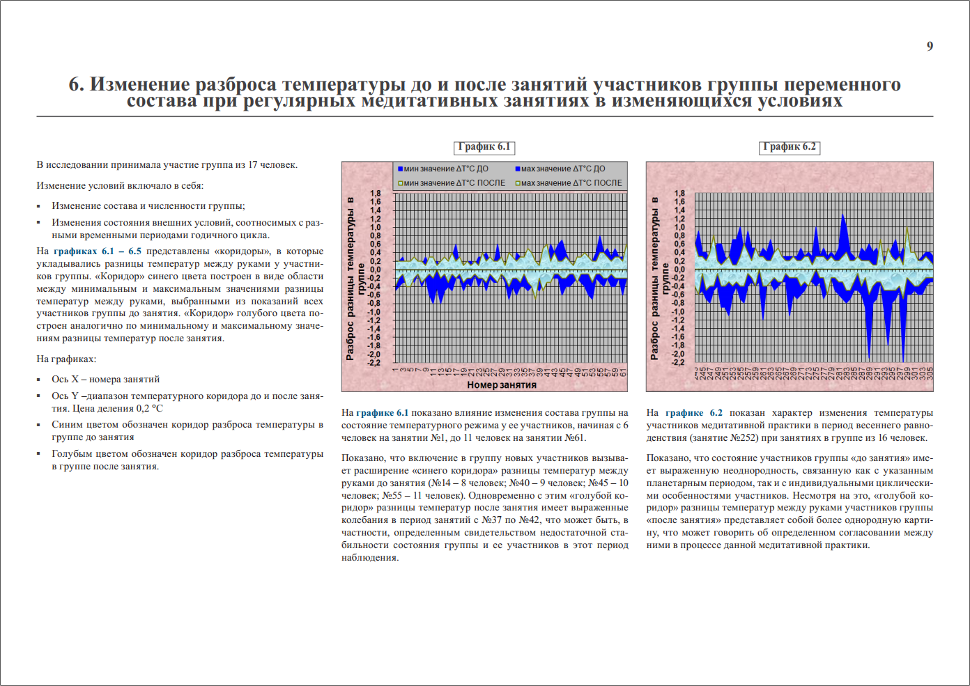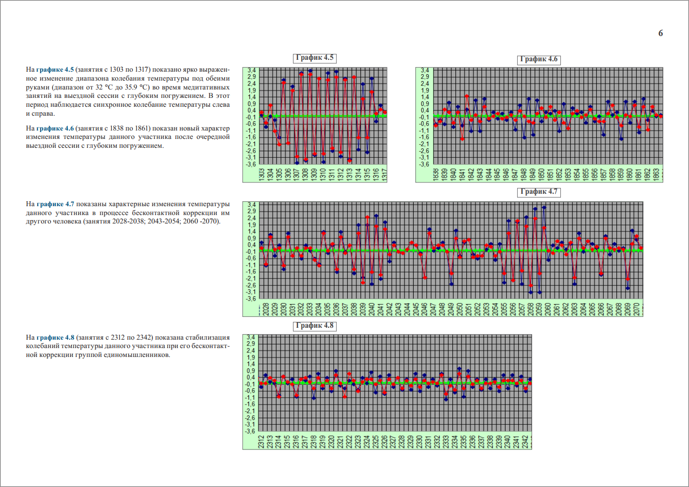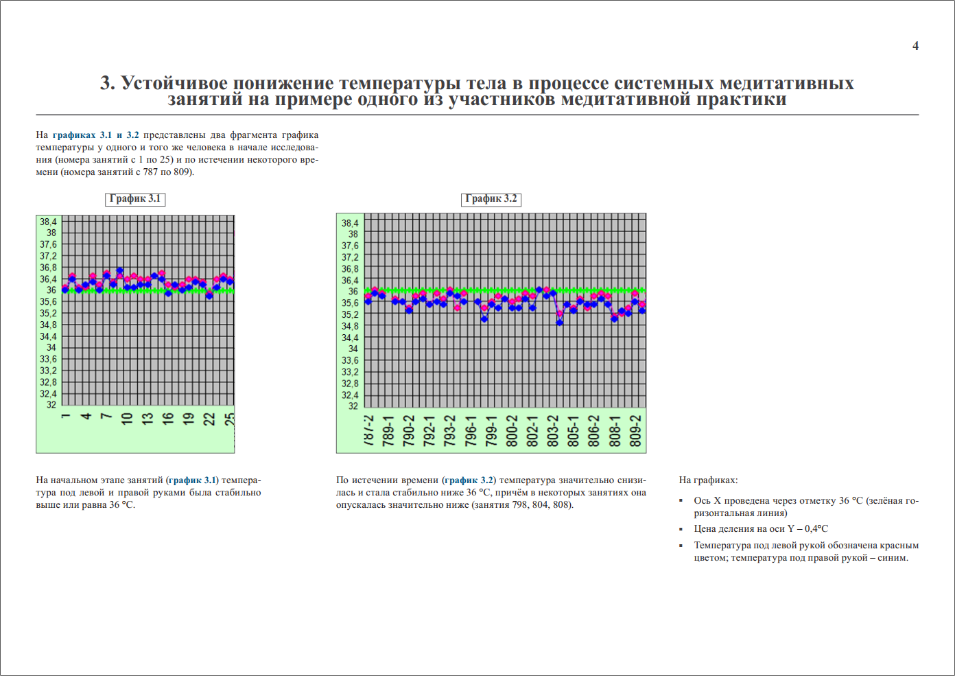 Результаты исследования 1. Температура, измеренная одновременно под разными руками у одного из участников медитативной практики На графике 1 показано, что разница повседневной температуры под левой и правой руками человека может быть более 1 °C. Кроме того, изменение температуры под разными руками может происходить несинхронно, а иногда и в противофазе. ![]() 2. Температура, измеренная одновременно под разными руками у двух участников медитативной практики На графиках 2.1 и 2.2 представлены фрагменты измерения температуры у участников группы из двух человек в разное время. Характер температуры у одного и того же человека меняется в течение времени (смотри номера занятий). Для наглядности на графиках 2.1 (в) и 2.2 (в) показана температура обоих участников. За период занятий с 905 по 915 температура у участника №1 (а) устойчиво держится ниже 36°C и имеет выраженные колебания, а у участника №2 (б), на том же интервале времени, температура устойчиво держится около 36°C с минимальными колебаниями. В период занятий с 2095 по 9105 ситуация обратная. Температура у участника №1 (а) устойчиво держится около 36°C с минимальными колебаниями, а у участника №2 (б) на том же интервале времени температура держится ниже 36°C и имеет выраженные устойчивые колебания. ![]() 3. Устойчивое понижение температуры тела в процессе системных медитативных занятий на примере одного из участников медитативной практики На графиках 3.1 и 3.2 представлены два фрагмента графика температуры у одного и того же человека в начале исследования (номера занятий с 1 по 25) и по истечении некоторого времени (номера занятий с 787 по 809). ![]() На начальном этапе занятий (график 3.1) температура под левой и правой руками была стабильно выше или равна 36°C. По истечении времени (график 3.2) температура значительно снизилась и стала стабильно ниже 36°C, причём в некоторых занятиях она опускалась значительно ниже (занятия 798, 804, 808). 4. Характерные изменения температуры у одного из участников медитативной практики при изменении условий занятия На графиках 4.1-4.9 представлено изменение температуры под левой и правой руками одного из участников медитативной практики во время занятий в разных условиях в течение длительного периода времени (2014 – 2020 годы). [/list]Этот пример может быть иллюстрацией как собственной внутренней цикличности человека, так и влияния изменений условий занятий, включая годичную планетарную цикличность. В частности, может изменяться температура после занятия, как в сторону увеличения, так и уменьшения под каждой рукой или может происходить смена алгоритма изменения температуры при появлении новых условий взаимодействия и т.д. На графике 4.1 показаны колебания температуры у участника медитативной практики в начале исследованного периода (занятия с 1 по 12): температура слева и справа достаточно синхронно колеблется вокруг отметки в 36 °С с амплитудой порядка 0,1-0,2 °С, что практически соответствует точности используемых термометров. На графике 4.2 (занятия с 30 по 42) показано выраженное изменение колебания температуры (того же участника) под обеими руками при включении в медитативные занятия двух новых участников, причём колебание температуры под правой рукой в этот период времени проявлено сильнее. На графике 4.3 (занятия с 228 по 239) показана стабилизация колебаний температуры (того же участника) под обе