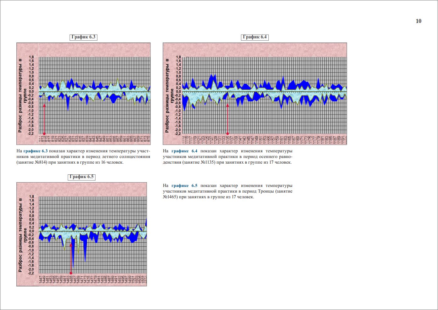 Готовится и скоро будет опубликована первая часть нашего исследования температуры человека во время медитативной практики. Исследование характерных изменений температуры тела участников бесконтактных взаимодействий Алексейцев А.В., Бельская Г.Н., Егорова Н.Б. Часть 1 В данном разделе описаны наблюдения за бесконтактным взаимодействием людей, где в качестве косвенного индикатора этого процесса взят один из интегральных параметров состояния человека и его тела – температура, измеренная под правой и левой рукой, у групп участников различных медитативных процессов, проводившихся нами на протяжении последних 25 лет. Нельзя утверждать, что данный параметр полностью описывает или характеризует состояние участников в процессе рассматриваемого взаимодействия, точно так же, как и сам процесс взаимодействия. Но тем не менее, это вполне понятный и наглядный вариант индикации отдельных граней этого процесса. При иллюстрации и анализе графиков температуры мы опираемся не только на температурные показатели, но и на множество других параметров своего состояния. Эти параметры соотносятся с определенной мировоззренческой систематикой и практическим опытом участия в различных бесконтактных взаимодействиях, многие из которых проводились под наблюдением врачей и специалистов с применением различной медико-диагностической аппаратуры. Это включало в себя электроэнцефалографию («Энцефалан-131-03» Medicom MTD), диагностику по методу Фолля, систему фрактального анализа сердечного ритма «Динамика–100» («Цифровой анализатор биоритмов «Омега-М»), диагностику давления и пульса, и другие методики, которые использовались, как с целью прямой индикации и контроля состояния участников непосредственно во время бесконтактного взаимодействия, так и с целью последующего контроля их психофизического состояния, в которых длительное время участвовали авторы данного исследования. Поэтому анализ графиков температуры, приведенный ниже, имеет под собой достаточно большой багаж реального опыта участия и наблюдения подобных взаимодействий. Из перечисленных выше методов измерение температуры и анализ ее изменений является самым простым и доступным методом оценки состояния участников взаимодействия. Исходные положения Наблюдая и исследуя свои состояния в процессе систематической медитативной практики и бесконтактного корректирующего взаимодействия с сознанием других людей, авторы заинтересовались температурой тела и ее изменениями, считая температуру интегральной характеристикой состояния организма человека. Эти исследования начались в 1995 году. И первое, что нас тогда удивило – это наличие выраженной разницы в значениях температуры, измеренной под разными руками. Последующие наблюдения проявили и различные особенности ее изменения, как в процессе конкретных медитативных занятий, так и на более отдаленном периоде времени. Обработанные на текущий момент времени данные, включают в себя измерение и анализ температуры при индивидуальных медитативных занятиях, занятиях в группах постоянного состава из двух и трех человек, а также при занятиях в группе переменного состава количеством от пяти до 17 человек, которые проводились в течение последних 10 лет. Также проанализированы данные измерений температуры при отдельных процессах бесконтактн