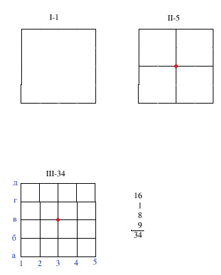 Рассмотрим квадрат I. Он состоит из одного квадрата. Разделим его вертикальной и горизонтальной линией (II). Получаем 5 квадратов (один большой и 4 маленьких). Продолжим деление (III).