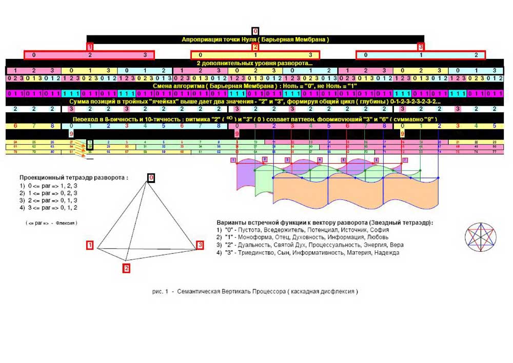 Заметим, что базовая плоскость в кольцевой модели представляет собой центральную секущую плоскость тора, вертикаль которого проходит через его «дырку». Ассоциативно можно здесь же добавить построение тетраэдра, стоящего одной из граней на этой плоскости и имеющего вершину на вертикали. Развивать эти структурные построения можно и далее, что в данном рассмотрении представляется нецелесообразным. Нужно только подчеркнуть тот факт, что чисто геометрическим рассуждениям следует давать интерпретацию с точки зрения функциональных возможностей рассматриваемой системы.